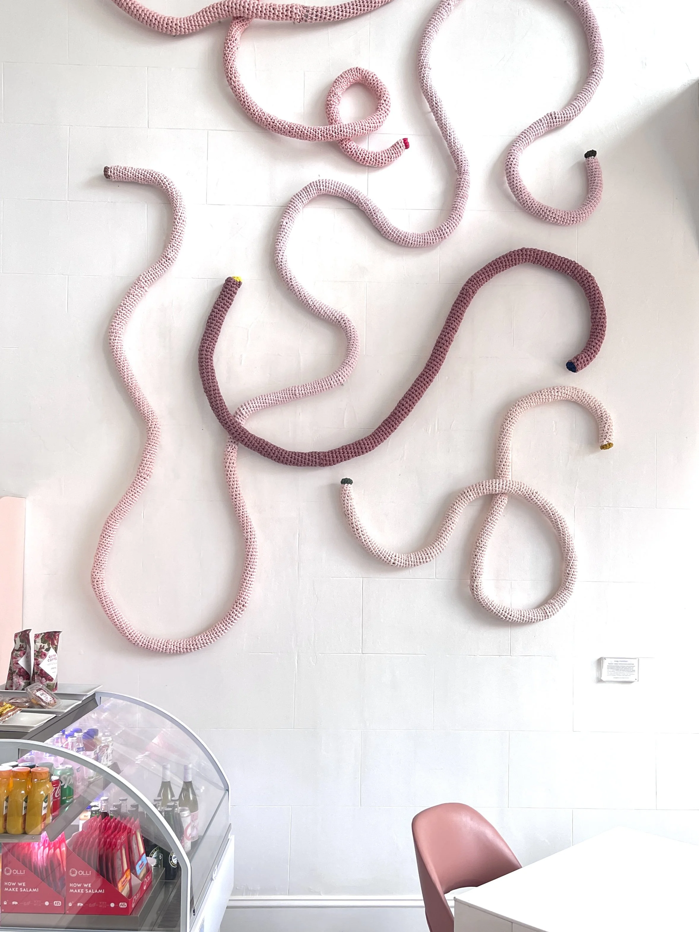 Meg Morrison Ceramic and Textile Artist Based in Richmond Virginia handbuilds decorate objects for the home and uses sustainable yarn from waste fabric to crochet and knit lamps and tables